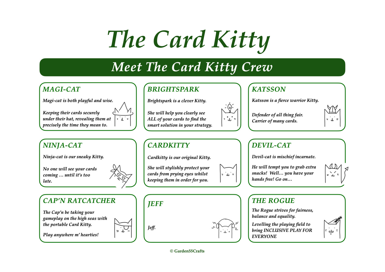 Each CardKitty is functionally identical, but their characters personify some of the many ways our CardKitty enables diverse and inclusive play.