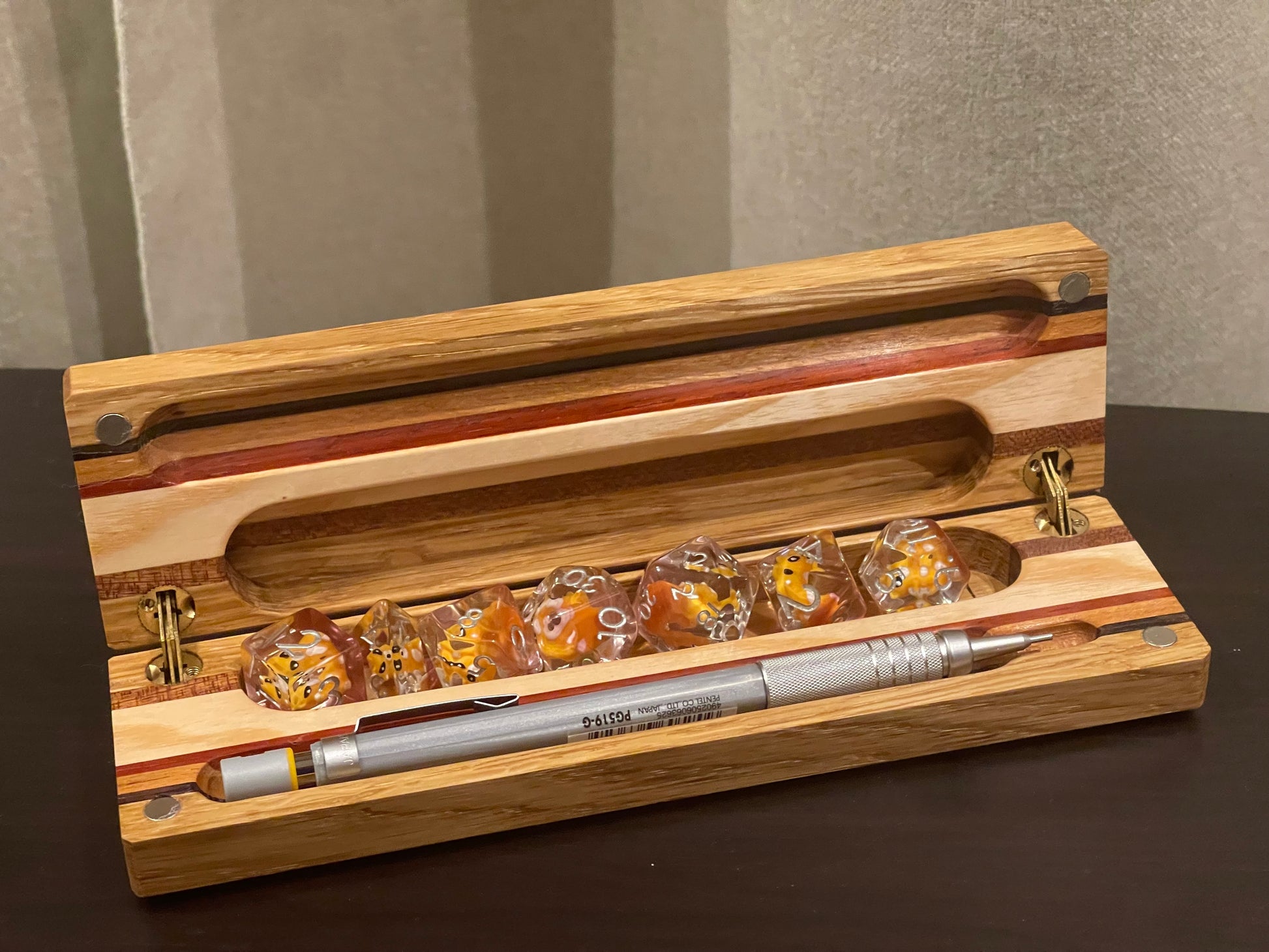 Supplied with Pentel Graphgear 500 pencil and space for a standard 16mm set of dice, and an additional d20 if required. (Dice not included. Will house a D20 up to a maximum size of 22mm). Finished with our usual durable Osmo Polyx hardwax oil and polished with Renaissance Microcrystalline Wax.